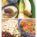 食材:火鸡1只、园糯米1一2磅(看火鸡的大小)火腿细丁0.2磅、蚝菇(king mushroom)丁0.35磅、胡罗卜和甜豆0.3磅、卷饼或荷叶饼、京葱丝和黄瓜丝量自定。